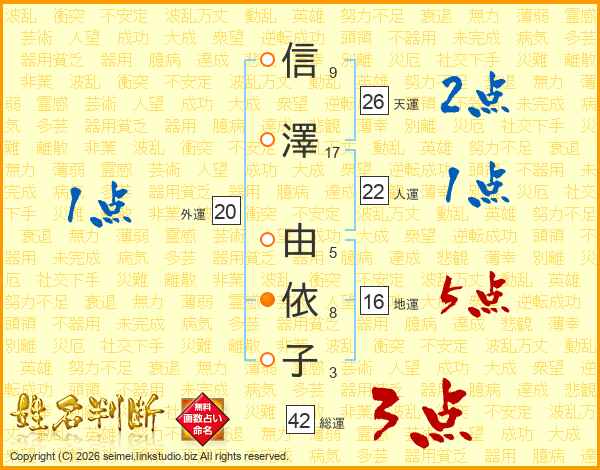 信(9画)澤(17画) 由(5画)依(8画)子(3画)