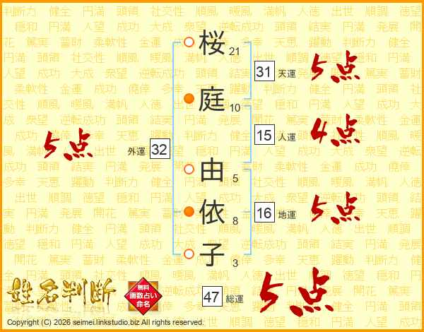 桜(21画)庭(10画) 由(5画)依(8画)子(3画)