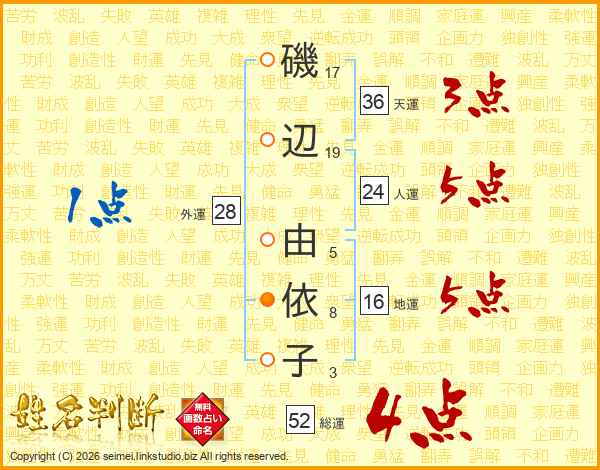 磯(17画)辺(19画) 由(5画)依(8画)子(3画)