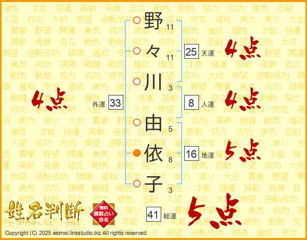 野々川由依子さんの総運は41画の5点!