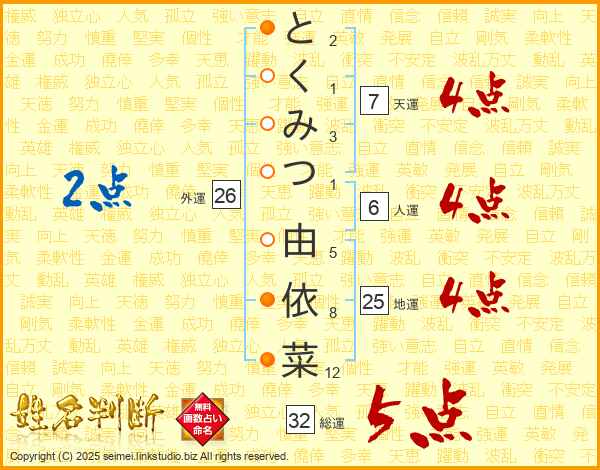 と(2画)く(1画)み(3画)つ(1画) 由(5画)依(8画)菜(12画)