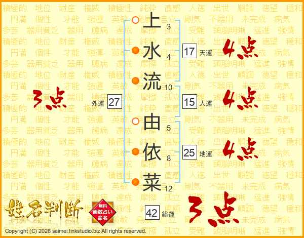 上(3画)水(4画)流(10画) 由(5画)依(8画)菜(12画)