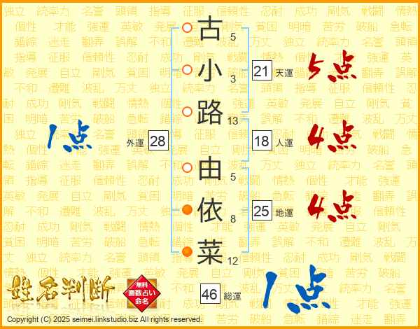 古(5画)小(3画)路(13画) 由(5画)依(8画)菜(12画)