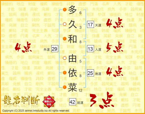 多(6画)久(3画)和(8画) 由(5画)依(8画)菜(12画)