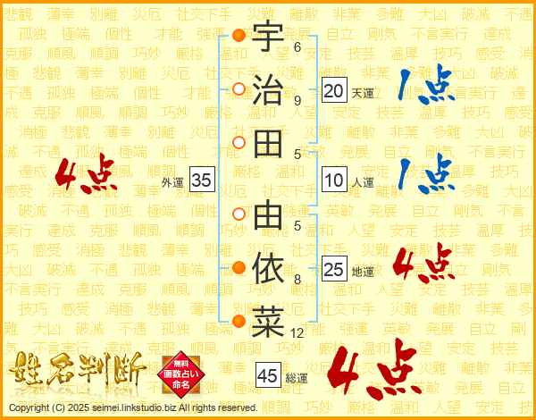 宇(6画)治(9画)田(5画) 由(5画)依(8画)菜(12画)