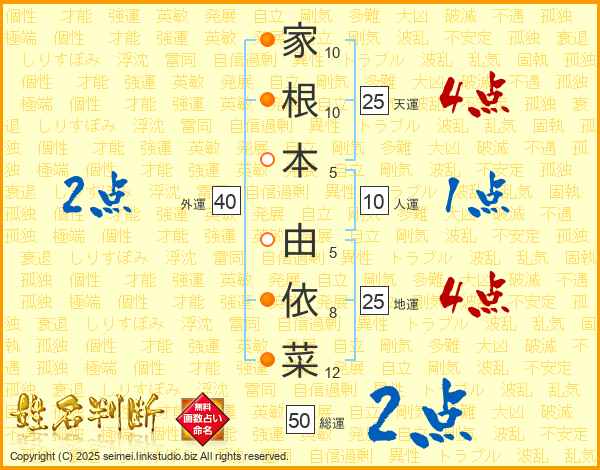 生活面を象徴する運勢です。外部から受ける影響力を表し、結婚運、家庭運や職場、環境への順応性を表します。総運から人運を引いた画数。姓や名が1文字の場合を除く。