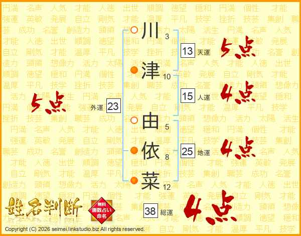 川(3画)津(10画) 由(5画)依(8画)菜(12画)