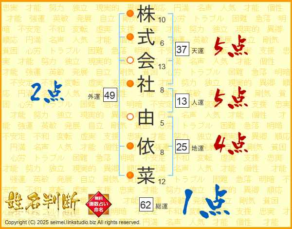 株式会社由依菜さんの総運は62画の1点!