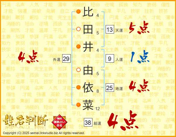 比(4画)田(5画)井(4画) 由(5画)依(8画)菜(12画)