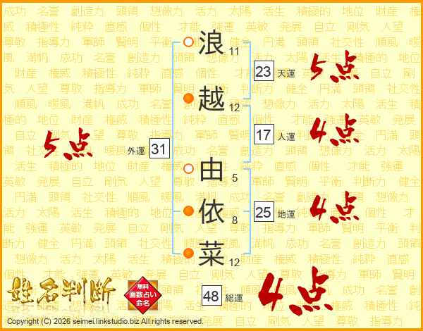 生活面を象徴する運勢です。外部から受ける影響力を表し、結婚運、家庭運や職場、環境への順応性を表します。総運から人運を引いた画数。姓や名が1文字の場合を除く。