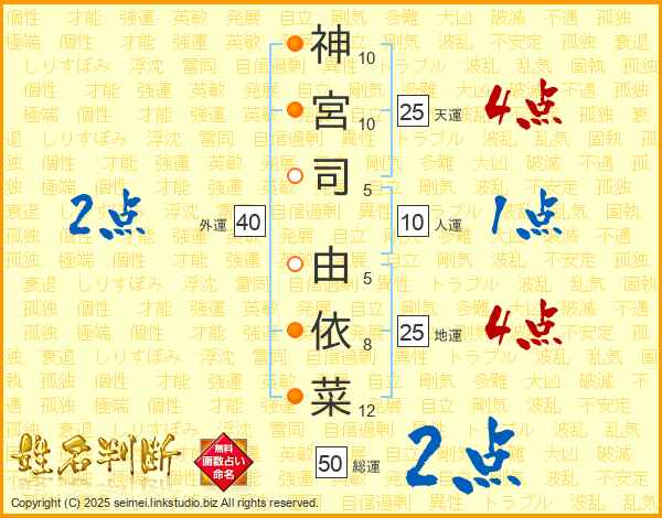 神(10画)宮(10画)司(5画) 由(5画)依(8画)菜(12画)