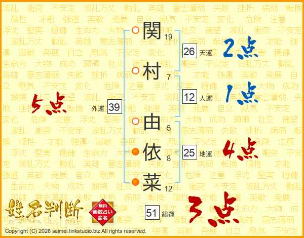 関(19画)村(7画) 由(5画)依(8画)菜(12画)