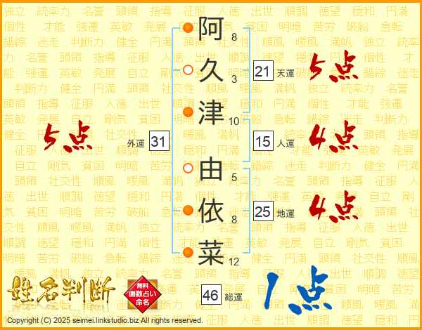 阿(8画)久(3画)津(10画) 由(5画)依(8画)菜(12画)