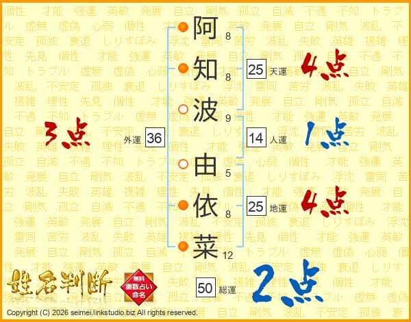阿(8画)知(8画)波(9画) 由(5画)依(8画)菜(12画)