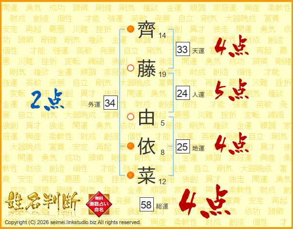 齊(14画)藤(19画) 由(5画)依(8画)菜(12画)