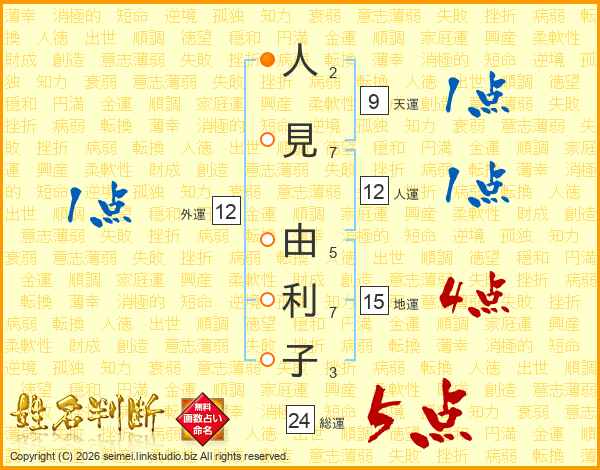 人(2画)見(7画) 由(5画)利(7画)子(3画)