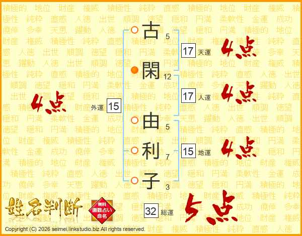 古(5画)閑(12画) 由(5画)利(7画)子(3画)