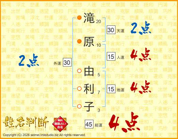 滝(20画)原(10画) 由(5画)利(7画)子(3画)