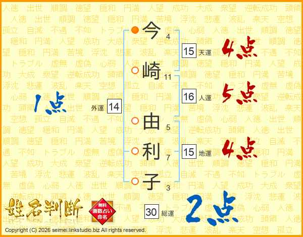 今(4画)崎(11画) 由(5画)利(7画)子(3画)