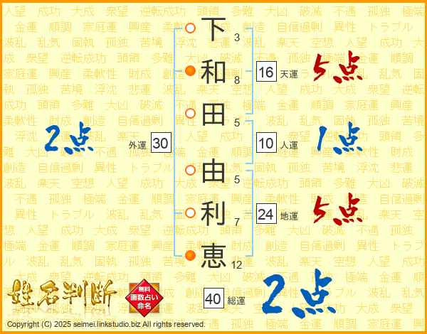 下(3画)和(8画)田(5画) 由(5画)利(7画)恵(12画)