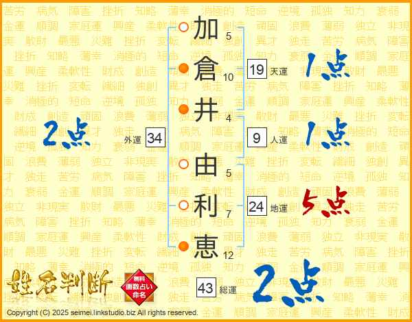 加(5画)倉(10画)井(4画) 由(5画)利(7画)恵(12画)