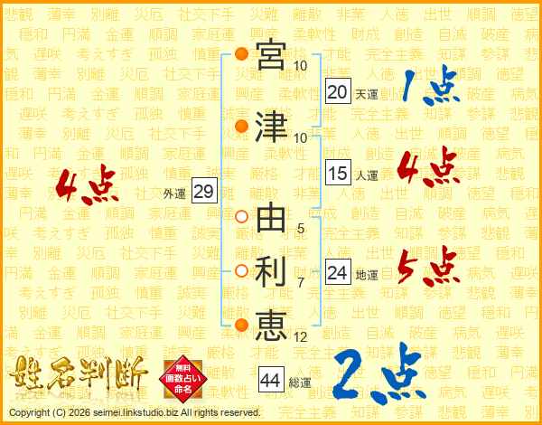 宮(10画)津(10画) 由(5画)利(7画)恵(12画)
