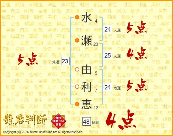 水(4画)瀬(20画) 由(5画)利(7画)恵(12画)