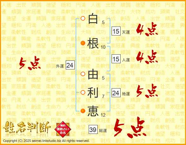白(5画)根(10画) 由(5画)利(7画)恵(12画)