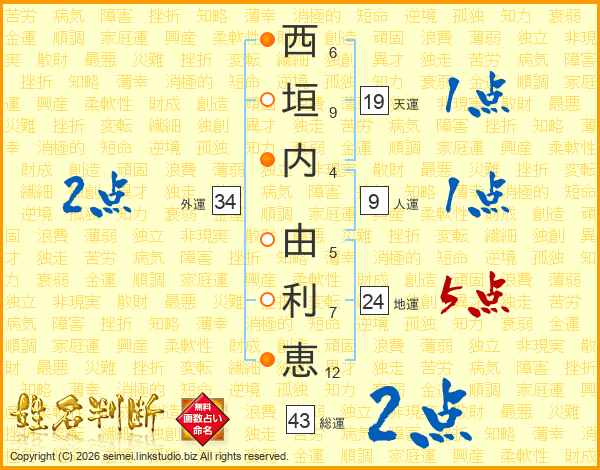 西(6画)垣(9画)内(4画) 由(5画)利(7画)恵(12画)