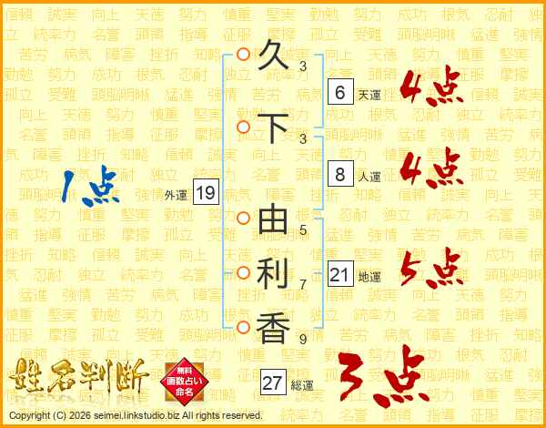 久(3画)下(3画) 由(5画)利(7画)香(9画)
