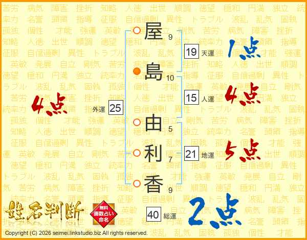 屋(9画)島(10画) 由(5画)利(7画)香(9画)