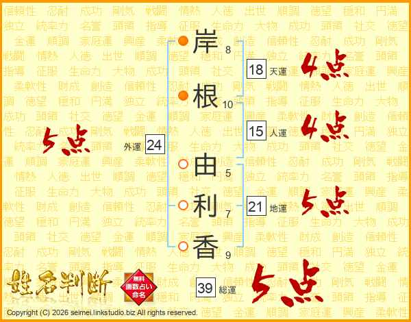 岸(8画)根(10画) 由(5画)利(7画)香(9画)