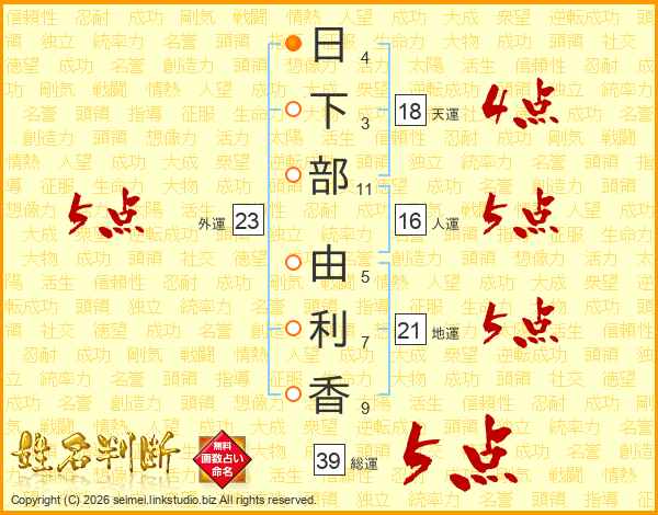 日(4画)下(3画)部(11画) 由(5画)利(7画)香(9画)