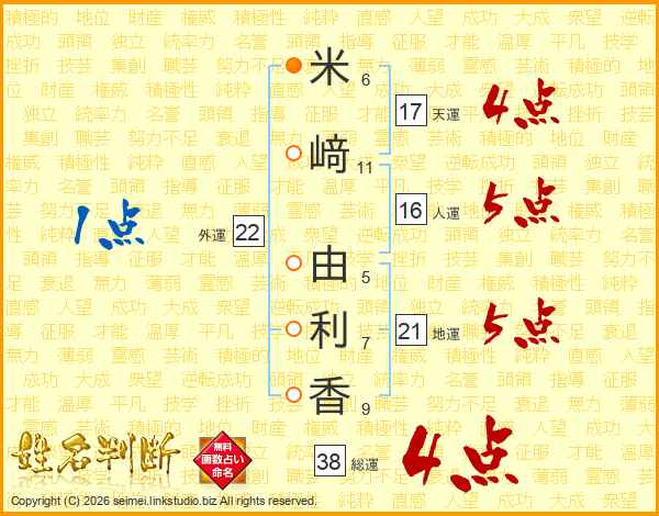 米(6画)﨑(11画) 由(5画)利(7画)香(9画)