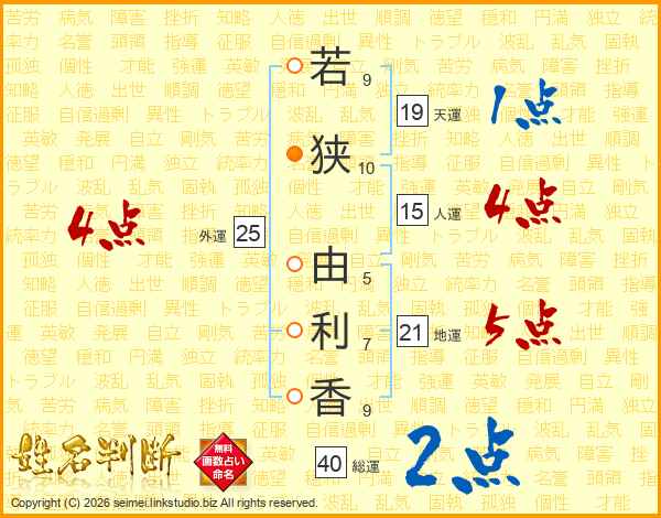 若(9画)狭(10画) 由(5画)利(7画)香(9画)