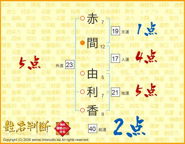 赤(7画)間(12画) 由(5画)利(7画)香(9画)