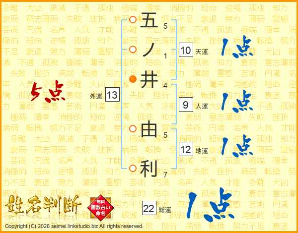 五ノ井由利さんの総運は22画の1点!