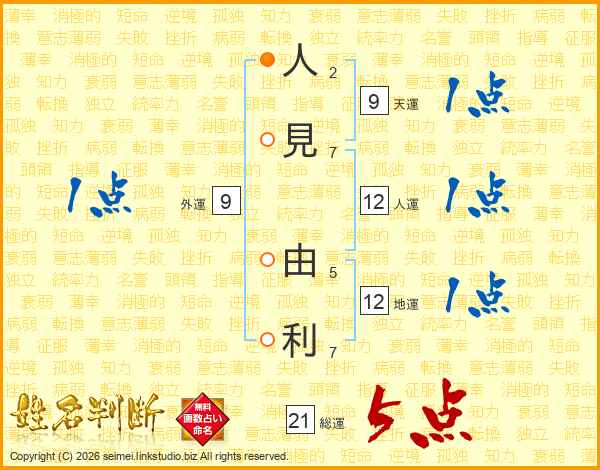 生活面を象徴する運勢です。外部から受ける影響力を表し、結婚運、家庭運や職場、環境への順応性を表します。総運から人運を引いた画数。姓や名が1文字の場合を除く。
