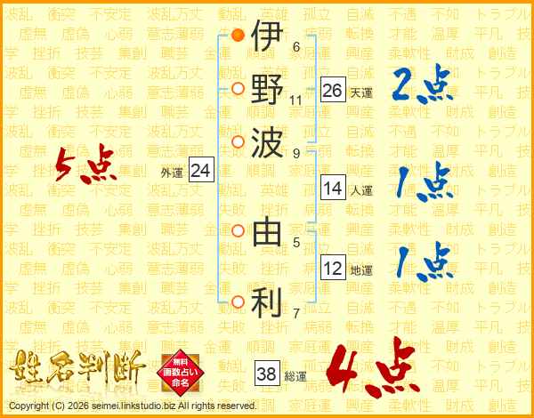 伊(6画)野(11画)波(9画) 由(5画)利(7画)