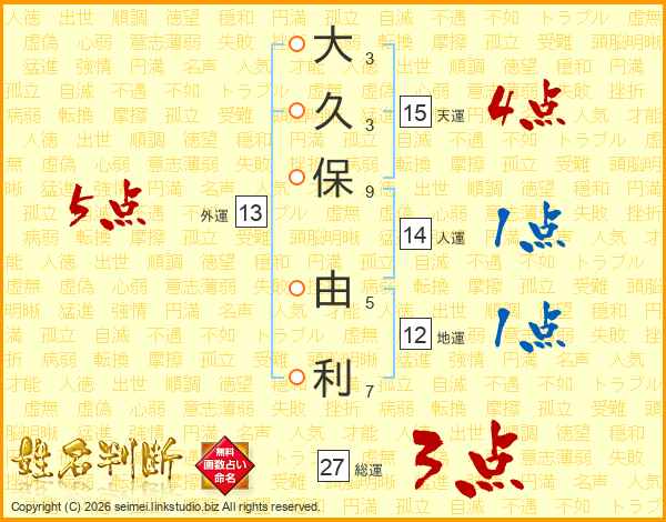 大(3画)久(3画)保(9画) 由(5画)利(7画)