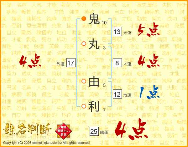 鬼(10画)丸(3画) 由(5画)利(7画)