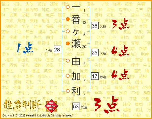 一番ヶ瀬由加利さんの総運は53画の3点!