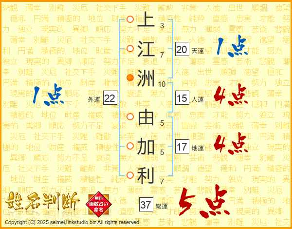 上(3画)江(7画)洲(10画) 由(5画)加(5画)利(7画)