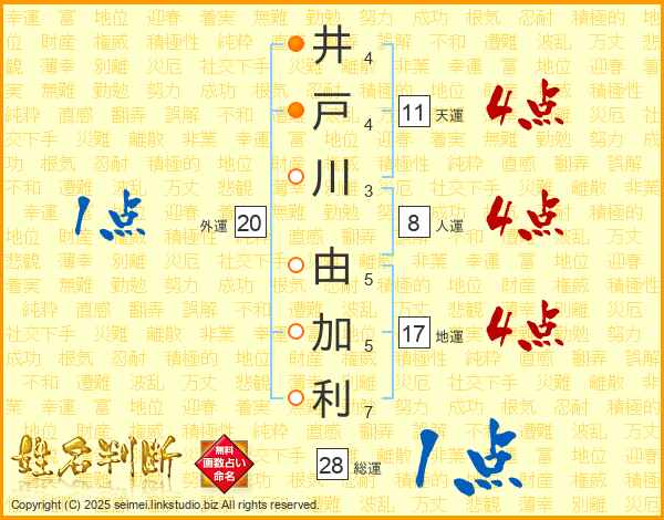 井(4画)戸(4画)川(3画) 由(5画)加(5画)利(7画)