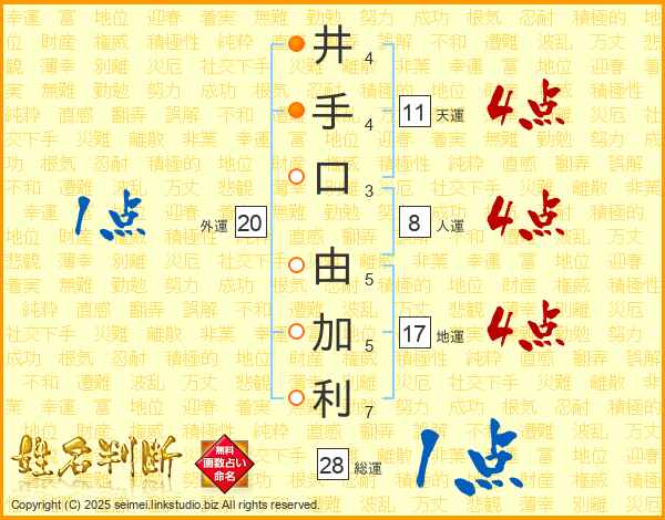 井(4画)手(4画)口(3画) 由(5画)加(5画)利(7画)