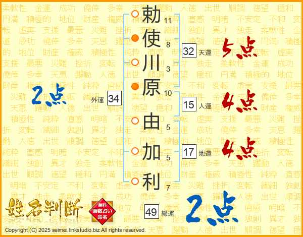 勅使川原由加利さんの総運は49画の2点!