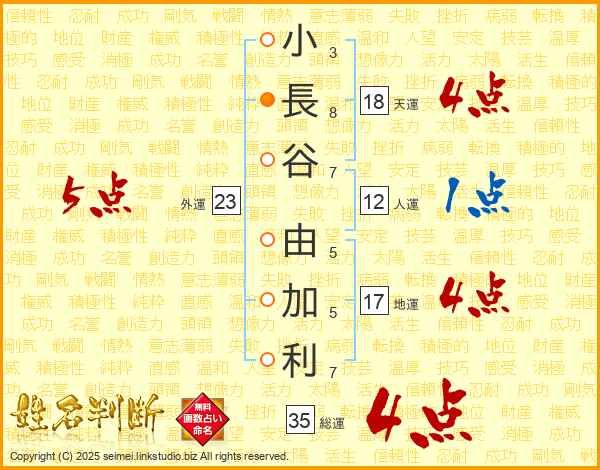 小(3画)長(8画)谷(7画) 由(5画)加(5画)利(7画)