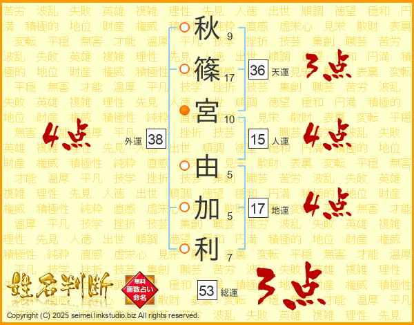 秋(9画)篠(17画)宮(10画) 由(5画)加(5画)利(7画)