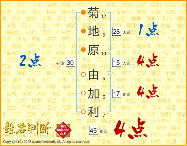 菊(12画)地(6画)原(10画) 由(5画)加(5画)利(7画)