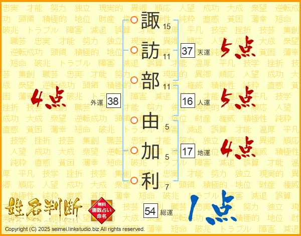 諏(15画)訪(11画)部(11画) 由(5画)加(5画)利(7画)